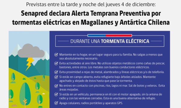 SENAPRED declara Alerta Temprana Preventiva por tormentas eléctricas en Magallanes